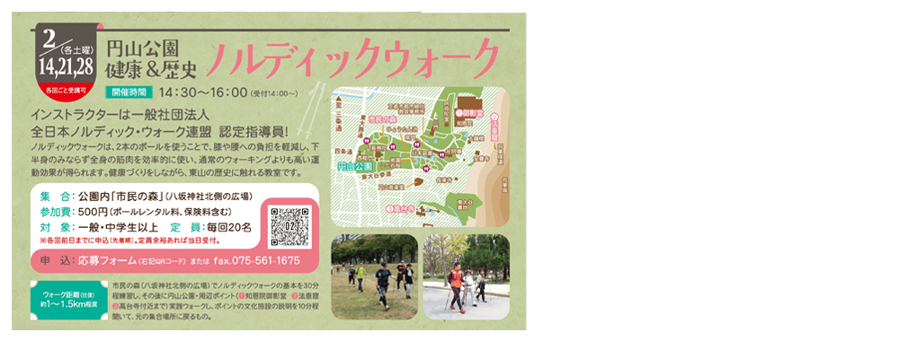 | 【概 要】 | 市民の森(八坂神社北側の広場)でノルディックウォークの基本を30分程練習し、その後に円山公園と周辺ポイント施設まで往復します。健康づくりと歴史に親しむ教室です。(各回ごと受講可。ポールはレンタルします。) |